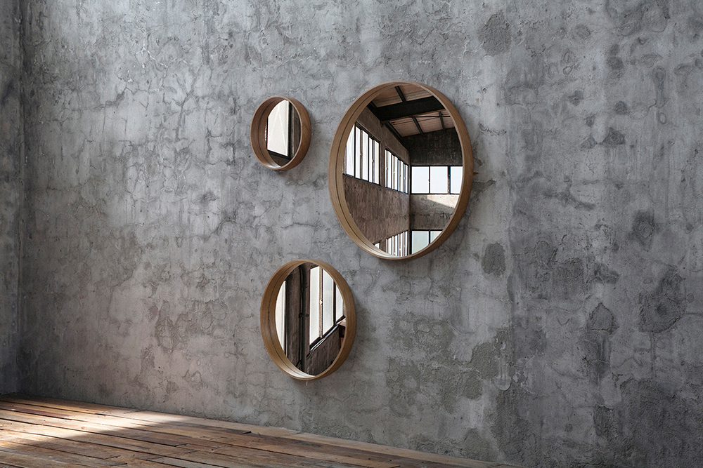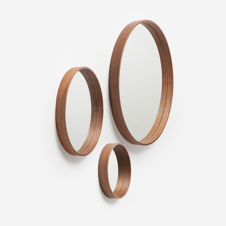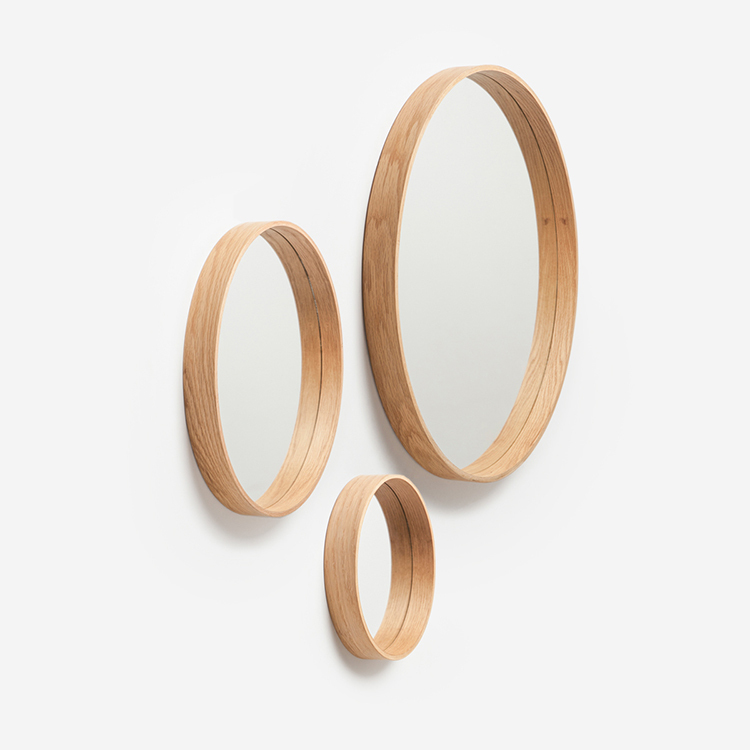 包含S (ø31cm)、M (ø50cm)、L (ø70cm) 三種尺寸的圓鏡各一面,每種尺寸都有兩種款式(白橡木、黑胡桃)可選擇。