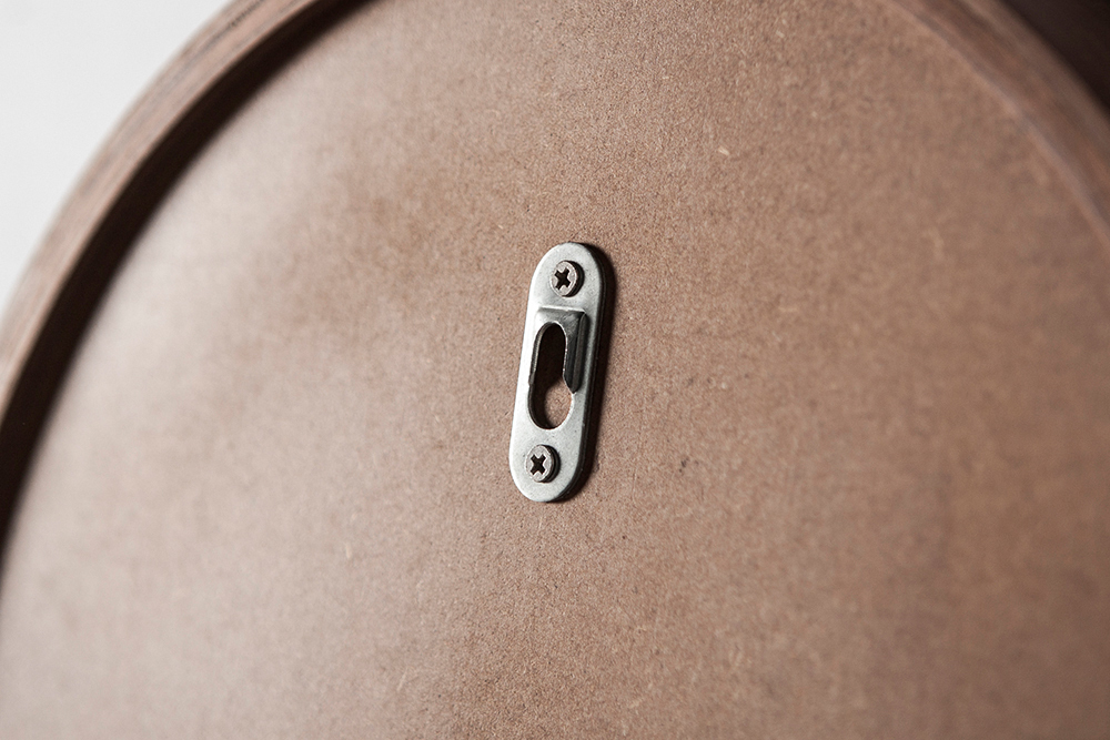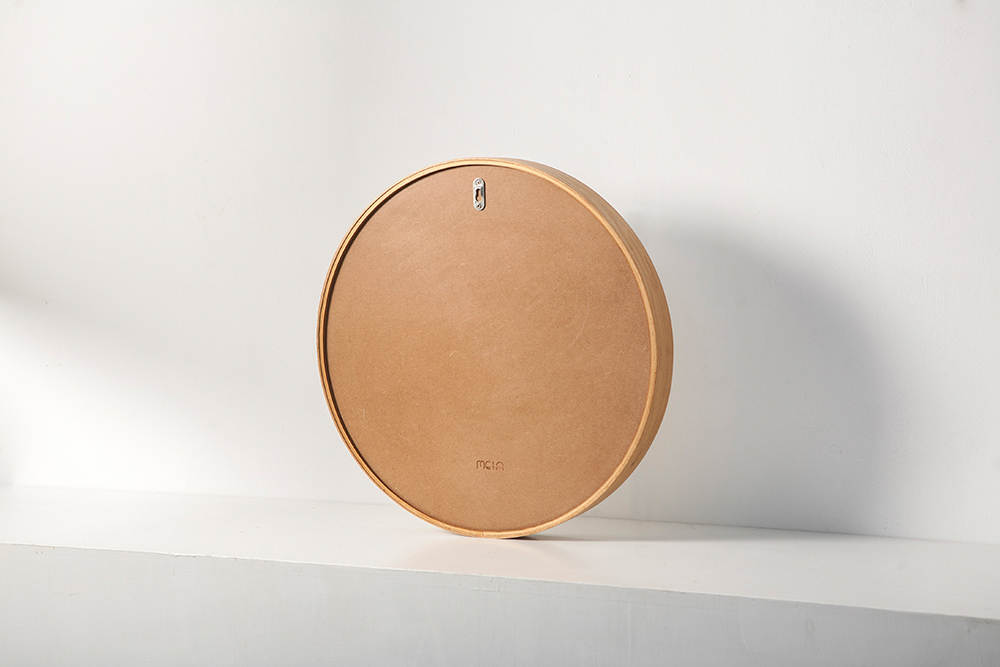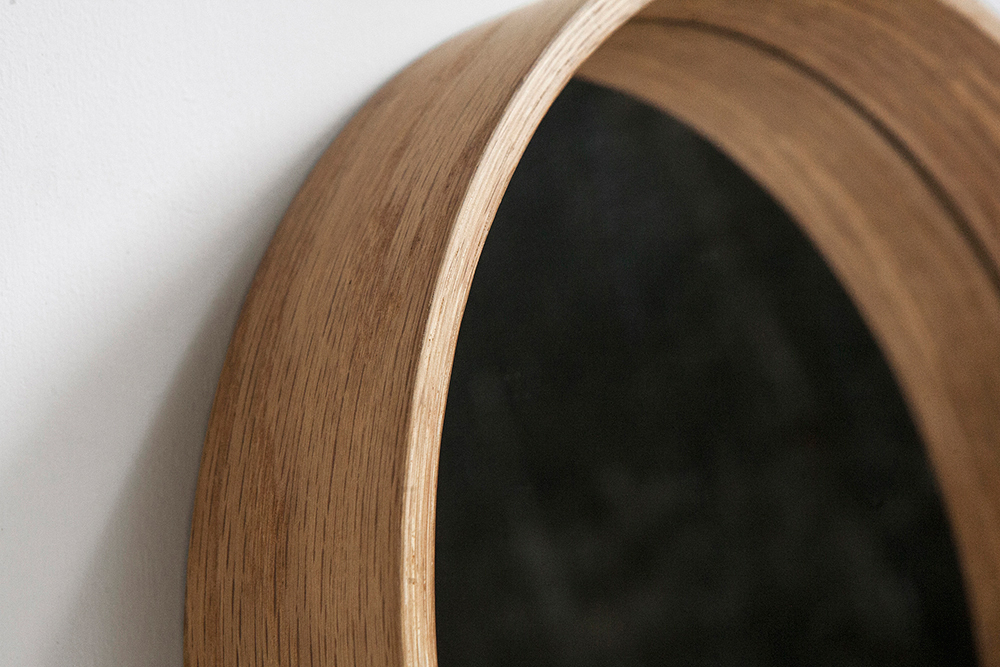 木質鏡框以曲木工法手工製作,將一層又一層的白橡木皮/胡桃木皮彎曲、加壓成型。