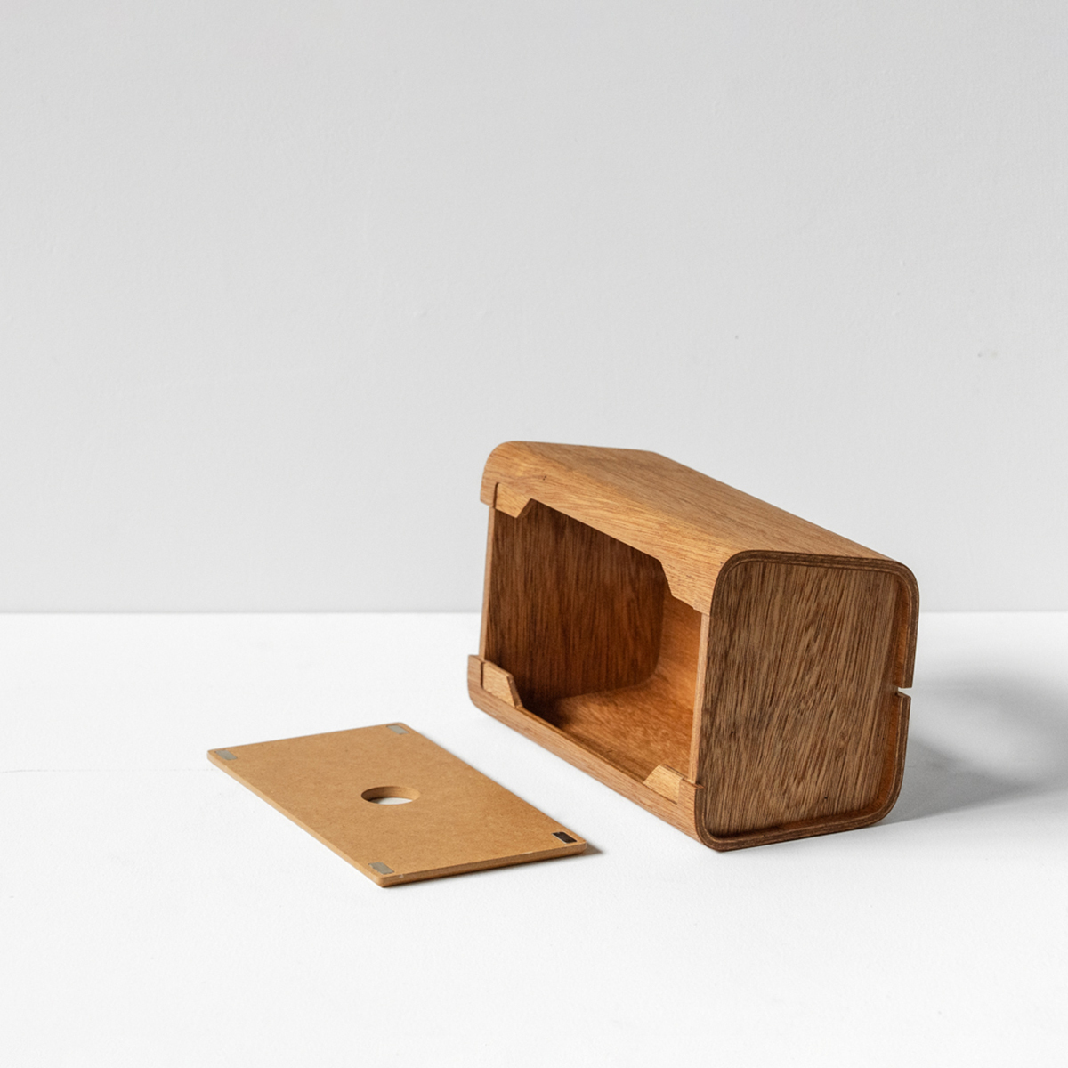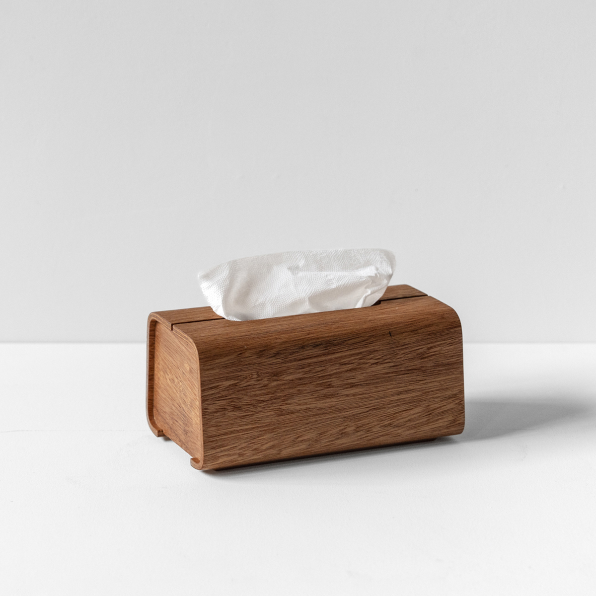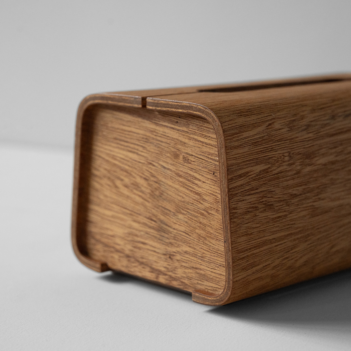 ▪︎ 「木皮集層曲木工藝」是將多層實木皮疊合,放入特製的模具中,透過控制壓力與溫度,將木皮彎折成型。Tetrad面紙盒的盒身以6層實木皮壓製成型,製作出溫潤優雅的弧度。