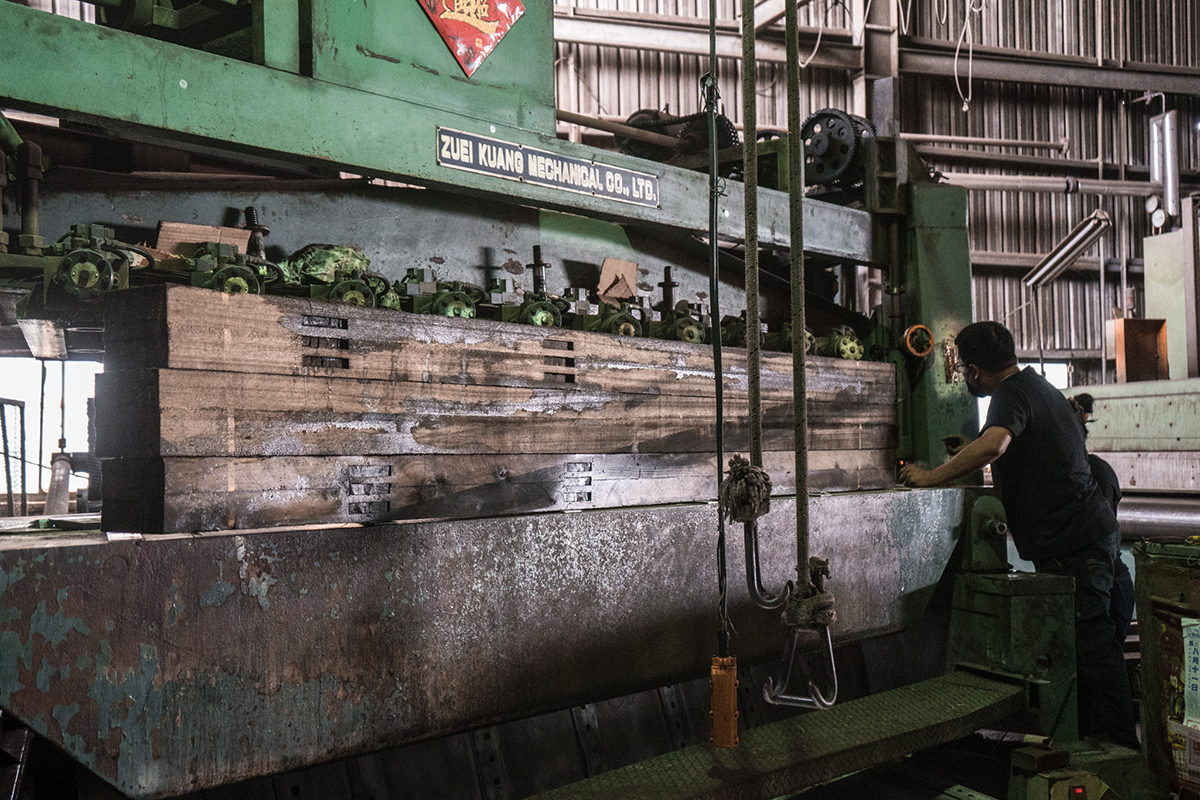 放上刨切機台前已經過除釘、去漆、補丁、浸泡等工序。