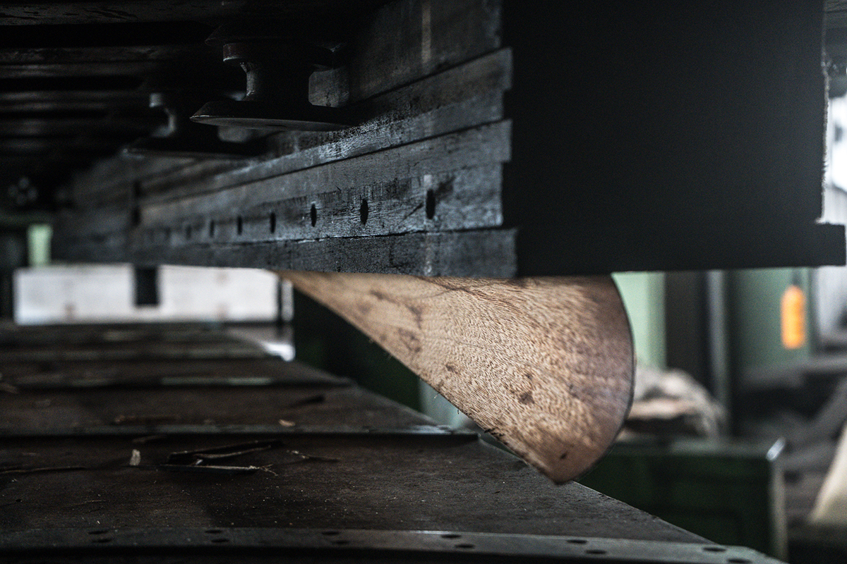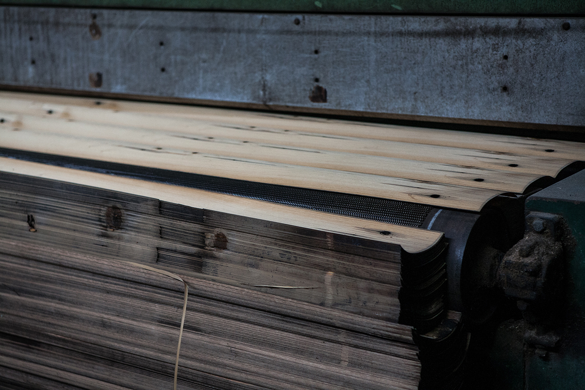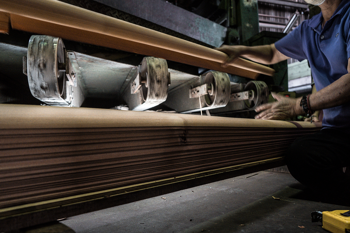 機台上的刀片來來回回,將門斗刨切成1mm厚的木皮。