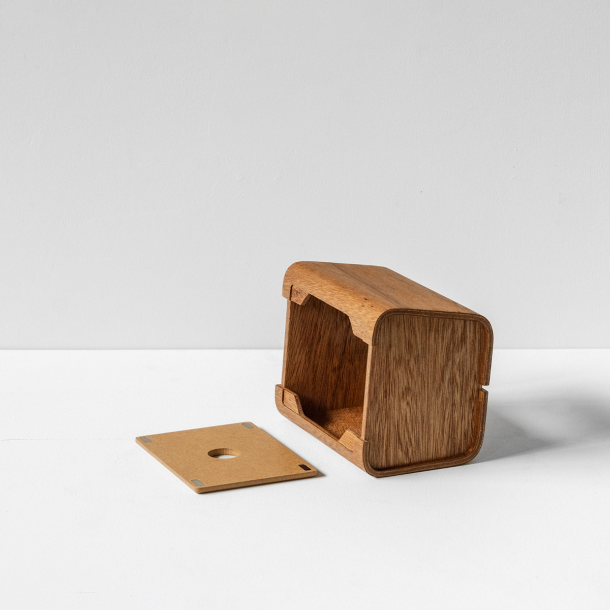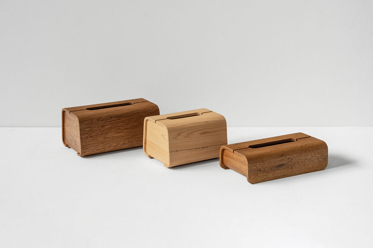 ▪︎ 「木皮集層曲木工藝」是將多層實木皮疊合,放入特製的模具中,透過控制壓力與溫度,將木皮彎折成型。Tetrad面紙盒的盒身以6層實木皮壓製成型,製作出溫潤優雅的弧度。
